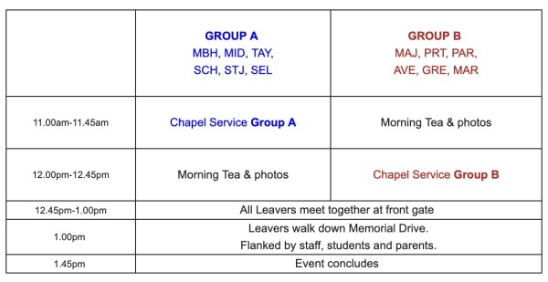 All Year 13 parents are invited and encouraged to join this special occasion to mark the final day at College for Senior Students. Two alternate Chapel services will be followed by the traditional leaver's walk down memorial drive. Photos will be available on the morning before and after Chapel services to capture this special moment with your family.