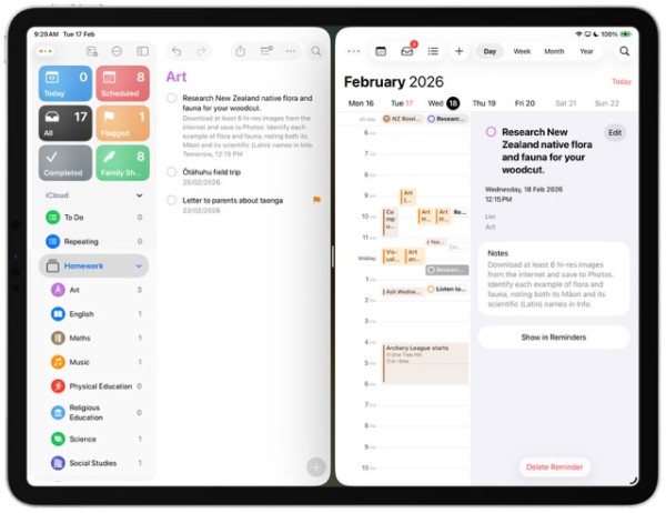 Our students sometimes face challenges juggling the many demands on their time: life suddenly becomes a lot busier at King’s College, and we expect every student to manage their own responsibilities. Using personal organisers can assist in helping them to stay on top of these demands. In the iPad introductory courses at the start of term, all new students were shown how to record prep in the Reminders app, and to sync that to Calendar on their iPads.