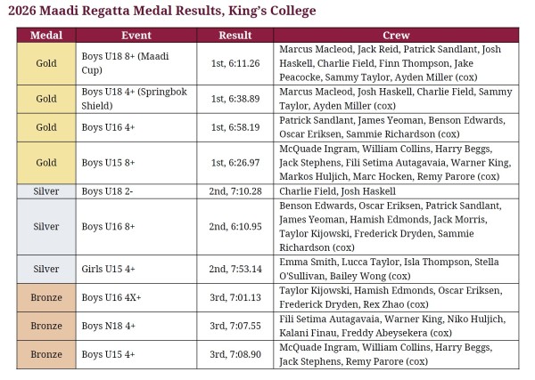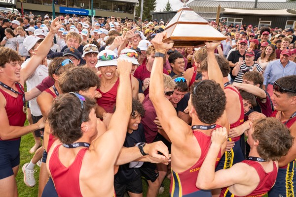 On Saturday 28 March, King’s College won the Maadi Cup for the first time since 1960, taking out the Boys Under 18 Coxed Eight in a time of 6:11.26. Auckland Grammar School finished second crossing the line at 6:14.82, with St Bede’s College coming third in 6:16.36. This meant that King’s had a winning margin of 3.56 seconds in the regatta’s premier event.